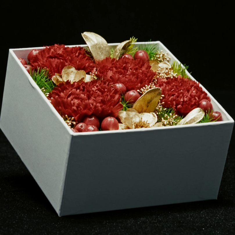 Presented in a structured box measuring 15cm × 15cm × 8cm, this arrangement is ideal as a refined festive gift or a quiet statement for the home.